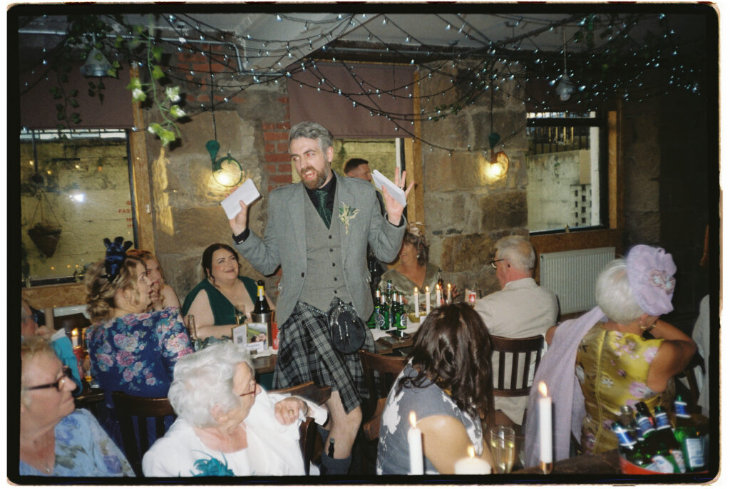Alongside full digital coverage, 35mm is documented extensively from morning to night. A second photographer works solely on film throughout the day, while I focus on telling the full story digitally and also shoot my own rolls of 35mm alongside it. Film is not just sprinkled in here. It is present across the entire day. Between us, a substantial amount of analogue is captured. The quiet in between moments, the movement, the atmosphere, the softer edges that only film holds. This is proper film coverage, not just a little add-on. You are getting a real body of 35mm work woven through your story. Everything is brought together into one cohesive gallery so it feels natural and complete. Film and digital sit side by side, shaping the same day in two different but complementary ways.